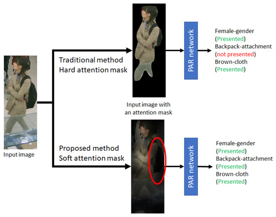 In recent research, deep learning has dominated the PAR research. Since PAR has multiple output attributes, multi-label [5], and multi-task learning [6] are used in PAR for handling binary and multi-class classification, respectively. However, the variants of attributes in PAR effect the performance greatly. Therefore, partial image classification was included in PAR to focus the local feature of each attribute and reduce the effects of image conditions. To be specific, this idea helps to reduce the region of interest (ROI) and categorize a corresponding area to a specific attribute. Recent studies applied partial image classification in pixel-level or hard attention (human parsing) [7,8] for extracting foreground regions as shown in the top row of Figure 1. However, the region surrounding the target might contain valuable information for global attributes (e.g., gender, age, career, and so on).