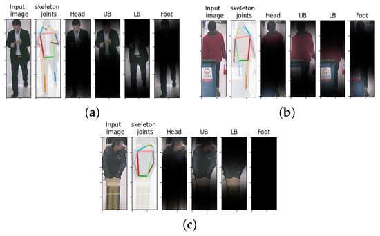 Equation (1) calculates an attention mask with class index ‘c’ (), where is the skeleton joint with index ‘j’, is 2D Gaussian kernels with standard deviation (‘’), and is the number of skeleton joint in each class, resulting in the average values of the convolution between skeleton joints and Gaussian distribution. Then, attention masks would be multiplied with feature maps to indicate ROI. The examples of input images, its skeleton joint, and ROI from each class are illustrated in Figure 3a. With OpenPifPaf, the hidden joints in partial occlusion can be estimated from their visible neighbor joints as dash lines (joint indices 13 and 16) in Figure 3b. However, we decided to ignore the attention mask of that part if the full occlusion occurred at the specific area as shown in Figure 3c. The resolutions of these attention masks also needed to be adjusted for the next step to match the size of input feature. Since the attention masks have the same resolution, is fixed as 30 in the experiment, which is a suitable value for generating masks, especially in an upper-body region.