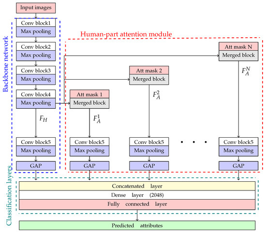 The overall proposed network architecture for PAR is shown in Figure 4, where networks fed by attention masks are the proposed approach in this paper. The proposed framework can be categorized into three parts consisting of the backbone network, human-part attention module, and classification layer. The first part was a baseline network utilizing well-known CNN focusing on global attributes from pedestrian images. The second part helped to extract local features in specific regions corresponding to attention masks. In the last part, classification layers received output features from the backbone network and human-part attention module to evaluate and predict attributes as the final output. The details for each part are described as follows: