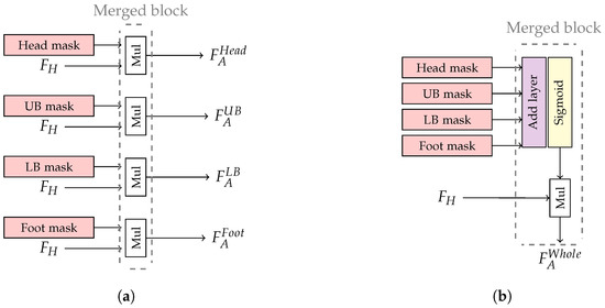 In the experiment, the performance of this module was expected to handle the variation of human poses from specific human parts. The human-part attention module was implemented into two versions consisting of separated and single masks. The separated mask utilized four attention masks consisting of Head, UB, LB, and Foot masks for extracting specific local features related to head, upper body, lower body, and foot attributes, respectively, where the merged blocks were represented as multiplication layers as shown in Figure 5a. The local feature in each body part can be optimized independently. On the other hand, the single mask combined all four attention masks to capture features within their overlapping regions or share local feature from different body parts as shown in Figure 5b. Moreover, an activation layer (‘Sigmoid’) was inserted to normalize the attention masks.