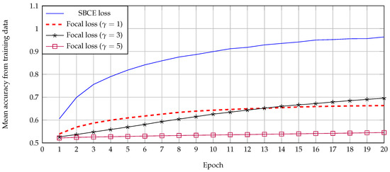 Mean accuracy from training data by using stable binary cross-entropy and focal losses with various values of .