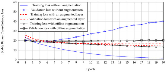 To show the effect of augmented layers, the learning curve between training and validation samples was analyzed as shown in Figure 8. Offline augmentation was also included as a traditional augmentation. This graph shows that the network optimization without data argumentation has a very high validation loss compared to its training loss. It caused an over-fitting error or a low classification performance in the testing samples. On the other hand, the difference between training and validation loss was very reduced by using an augmented layer compared with traditional augmentation. Therefore, data augmentation by these techniques can be practically used to reduce the effect of over-fitting errors and be more suitable in the issue.