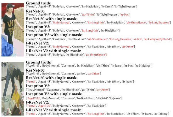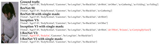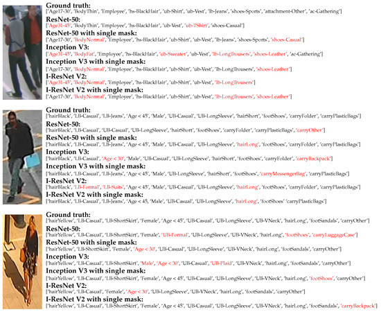 Since the role of the attention mask is to extract salient features within interested regions, our method is expected to ignore background or surrounding regions in the experiment. Not only was the surrounding object discarded, false targets should be discarded as well. As you can be seen in Figure 9 (the first row), more attributes were presented by the backbone network with a single mask. Since our target was selected from the size of the skeleton mask, the attributes of an actual target (the man on the left) can be presented, especially on the age attribute. On the other hand, the PAR networks without attention masks might obtain another target feature (the man on the right) because the wrong age was presented.
