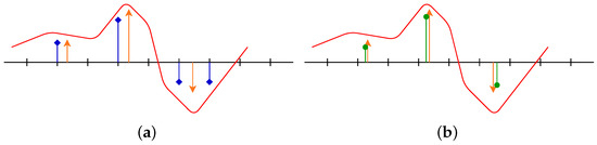 (a) Discrete reconstruction, which can be seen as spikes with support constrained on a grid; (b) off-the-grid reconstruction, the spikes can move continuously on the line. The red line is the acquisition y, orange spikes are the source (the cause we want to retrieve), blue spikes are discrete reconstruction constrained on a grid and green can move freely since it is off-the-grid. Note that, when a source spike is between two grid points, two spikes will be recovered in the discrete reconstruction.