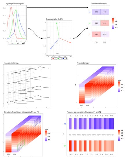 The second row depicts the procedure for a larger image: the grid on the left represents the pixels of the image, while the curves correspond to the spectral distributions for (some of) these pixels. Suppose that the dimension of the image is , where is the dimension of the grid while ℓ refers to the number of recorded hyperspectral frequencies. The RDLA algorithm then compresses the distribution of each pixel in just two principal components ( and ), providing a smaller data with size . Consider now two pixels, namely and , and their 8–neighborhoods in each component: in the previous notation, this hence amounts to have and . Then, the vectors and that collect all the feature values of and and relative neighborhoods, respectively, belong to : we can compute the similarity index as