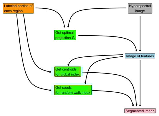 The first assumption requires images that present several regions with similar features, and we require a noise level that allows to distinguish the different regions. See [48,49,50] for a discussion on noise affecting data. Based on the second assumption we include a dimension reduction as a first processing step. For classification, in the lower dimensional space, we expect that data are well separated. Then, in the low dimensional space nearby points or points on the same structure (cluster or manifold) are likely to have the same label. In our case, nearby points are those pixels with similar features. Assumption (a) refers to a local property of the image: in an homogeneous region there is an high probability that a random walker remains in such region, whilst it is unlikely that it can reach a far but similar region. On the other hand, Assumption (b) refers to a global property of the image: similar regions may share similar spectral signature even if they are distant.