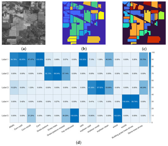 The first experiment refers to the Indian Pines dataset: the original image is depicted in Figure 3a, the segmentation result in Figure 3b whilst the ground truth labels are in Figure 3b. These results are obtained by setting and in Algorithm 2. The Rand Index for this particular experiment is 0.8505, while the OA is 0.9029: this means that each user-marked label contains the most part of a region marked in the ground truth. This result is clearly shown in Figure 3d: the element in position shows the percentage of the pixels in ground truth label j which are marked as belonging to the user-marked label i.