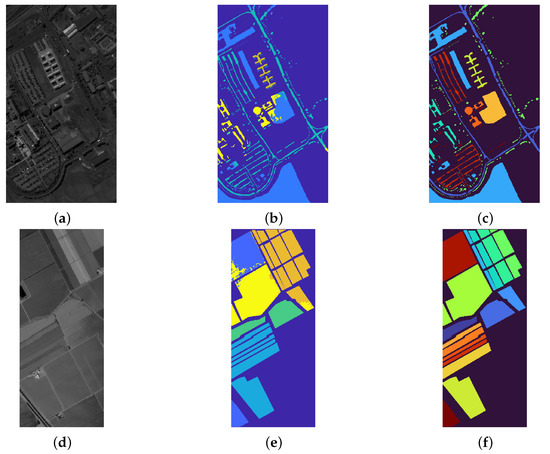 (a–c): false grayscale image, segmentation result and ground truth labels for the Pavia University dataset. (d–f): false grayscale image, segmentation result and ground truth labels for the Salinas HSI dataset. The former experiments achieves an Overall Accuracy of 0.93, whilst the latter achieves an OA of 0.9696.