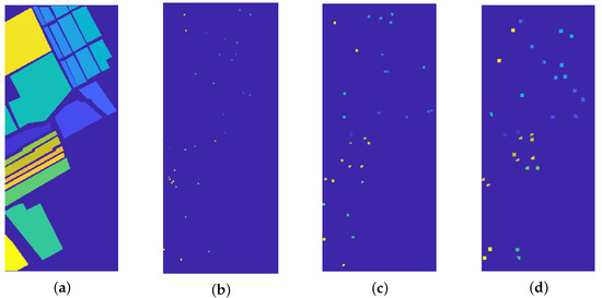 This section makes use of the datasets Indian Pines, Pavia University, and Salinas HSI. As previously mentioned, the proposed method belongs to the class of semi-supervised techniques: the initial seeds, i.e., the user-marked regions, are in a lower number then the original ones, that are 16, 9, and 16 for Indian Pines, Pavia University, and Salinas HSI, respectively. We denote with the ground truth, which contains labels, and with the marked subsets. We select manually labels on the dataset: this will produce a segmentation result with marked regions . In order to assess the performance when the ground truth contains a number g of labels greater than , we make use of the following indexes.