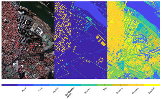 - Pavia Center: this image refers to the center of the city of Pavia, but some samples in this dataset contain no information: the spatial size is and it is then reduced to . The considered spectral bands are 102, leading to a final size of 783,640. The spectral bands lie in the interval 430–860 nm and the ground resolution is 1.3 m. The ground truth labels are Water, Trees, Asphalt, Self-Blocking Bricks, Bitumen, Tiles, Shadows, Meadows, Bare Soil.