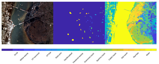 Segmentation results on the KSC dataset. From left to right: false color image, ground truth labels employed as seeds, and segmentation result. On the bottom of the images the legend associates the color to the labels.