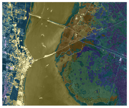 We apply the same strategy (using the ground truth as an atlas) to the KSC dataset, where the main aim is to segment the different type of vegetation. Figure 8 presents the visual representation of the segmentation result, obtained by setting and . The right part of the image present a reliable segmentation, since the different parts of terrain and vegetation are well recognized. On the other hand, the segmentation result on the left part classifies some buildings as part of vegetation or water, since the ground truth does not present any label referring to human constructions, such as buildings, bridges or streets. Figure 9 is devoted to showing the reason why some buildings are included in the Water label: indeed, the river contains several white parts which the segmentation process correctly includes in the Water label. On the other hand, there are several buildings that present a spectral signature (both in the visible and in the infrared region) very similar to these white regions inside the river. The picture shown in Figure 9 also better exposes the reliable performance on the right part of the image.