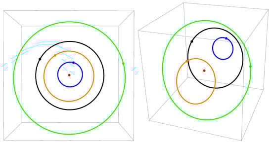 In Figure 2, the orbits of the Poincare map in the space are shown. The red dot corresponds to the orbit of a periodic trajectory with initial value , , . For the rest of the trajectories, the following parameters were used. For the orange trajectory, , , . For the green trajectory, , , . For the black trajectory, , , . For the blue trajectory, , , . The number of iterations of the Poincare map for all trajectories was chosen as .