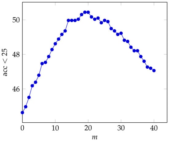 Effect of the parameter m on the retrieval accuracy under 25 m for the Adelaide test query.