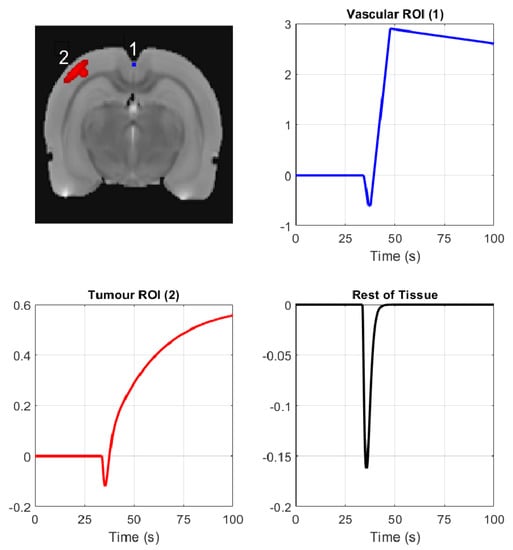 Figure 1 shows the signal templates generated for each of the three regions of interest. We created 2800 ground truth images based on the signal templates by multiplying the signal of each pixel in the original image with the signal template of the corresponding region and adding the result of the multiplication to the original value of the pixel. The three template signals were based on an experimental DCE-MRI measurement, which is described briefly in Section 3.2 and also in [28,29], from which the three different regions of interest (ROIs) were identified. The same simulated test case has been used previously in [17,28].
