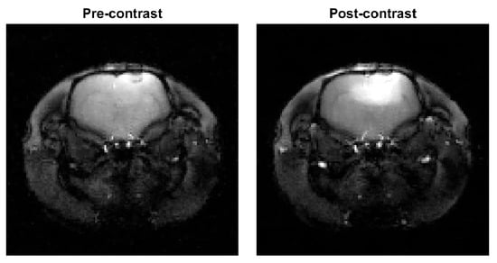 Cartesian gradient-echo pulse sequence full data reconstructions with spatial total variation (TV) regularization from before and after contrast injection used as a reference. The two images have the same adjusted color scale.