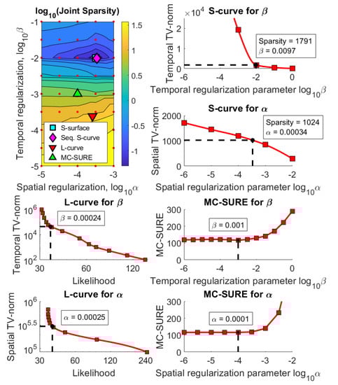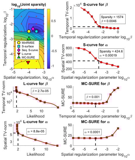 Figure 6 and Figure 7 show the results for the experimental data. Figure 6 shows the joint sparsity grid of reconstructions with a large grid of spatial and temporal regularization parameters where the S-surface, Sequential S-curve, L-curve and MC-SURE parameter pairs are marked. The figure also shows all the parameter selection curves used to select both and with the Sequential S-curve, L-curve and MC-SURE methods. The parameters obtained with the S-surface and Sequential S-curve methods are almost the same, namely, the Sequential S-curve parameters are , , and the S-surface parameters are , . The parameters obtained with the L-curve method are , and the parameters obtained with the MC-SURE method are , .