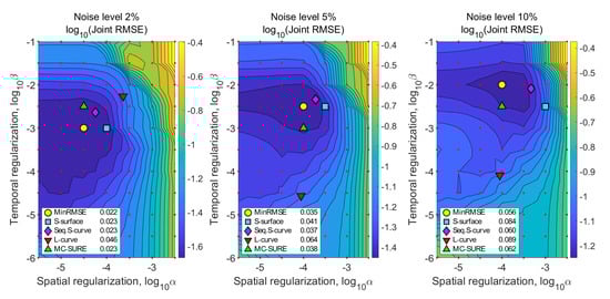 Figure 4 shows the joint RMSE contours of the reconstructions calculated on a wide grid of the spatial and temporal regularization parameters for the simulations with noise levels 2%, 5% and 10%. Figure 4 also shows the joint RMSE values of the reconstructions with the parameters chosen with the three different methods. The joint RMS error values for the Sequential S-curve, S-surface and MC-SURE reconstructions are similar to each other with the noise levels 2% and 5% and close to those of the optimal reconstruction (MinRMSE), and the regularization parameters obtained with these methods are also close to the MinRMSE parameters. In the simulation with 10% noise level, the S-surface performs worse than Sequential S-curve and MC-SURE in the joint RMSE measure. The L-curve method performs worse than the other methods with all three noise levels.