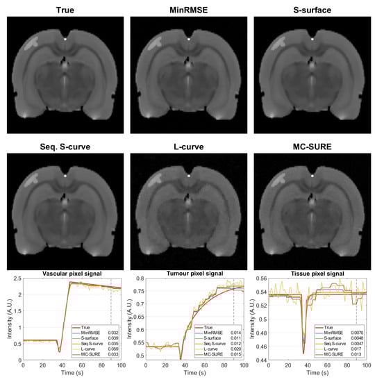Figure 5 shows single frames of the reconstructions of the data with 5% noise after contrast agent injection as well as single-pixel signals from the tumor and vascular areas as well as healthy tissue on the right side of the cortex and the RMSEs of the three regions. The MinRMSE, S-surface and Sequential S-curve reconstructions (with 5% noise level) in Figure 4 appear mostly similar, whereas the L-curve and MC-SURE reconstructions are slightly noisier. Figure 5 also shows the RMS errors of the three different regions. In the region-based RMS error measures, the Sequential S-curve and S-surface yield the best accuracy in the tumor and tissue signals, while MC-SURE has the best accuracy in the vascular region.