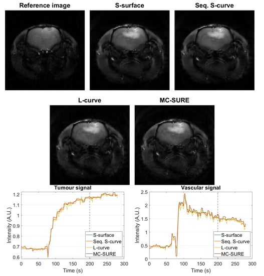 Figure 7 shows the cartesian reference reconstruction with spatial regularization from before contrast agent injection and single-frame images from the dynamic reconstructions using parameters obtained with the different methods from after the contrast agent injection. The reference image is the same as in Figure 2 with different contrast. Figure 7 also contains single-pixel signals from the tumor and vascular regions. The reconstructions are mostly visually similar, and the single-pixel signals of the Sequential S-curve and S-surface reconstructions show less variation than those of the L-curve and MC-SURE reconstructions which yield smaller values of the temporal regularization parameter than the sparsity-based selections.