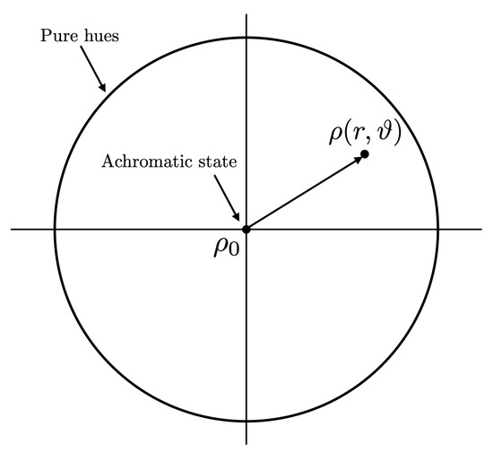 On the geometrical side, it is quite remarkable that the set of quantum chromatic states can be embedded in the closure of the future lightcone via the projective tranformation (70), where it is identified with the Klein disk equipped with the Hilbert metric. This mathematical richness and clarity stands out even more if we compare it with the construction of the CIE chromaticity diagram, which is also built through a projective transformations of the CIE coordinates, namely , and . The flag-like shape of the CIE chromaticity diagram is far from having the regularity of a disk, moreover, it must be artificially closed with the purple line and, most importantly, it does not come naturally equipped with any metric. This last fact generated a lot of confusion when the well-known MacAdam ellipses [63] were discovered and, eventually, when the ‘uniform’ color spaces such as CIELab, CIELuv, etc. were build, the metric choice felt arbitrarily on the Euclidean distance. To cope with the non-Euclidean behavior of perceptual chromatic attributes, the coordinates of these spaces had to be artificially adjusted to fit the data with ad hoc transformations and parameters.
