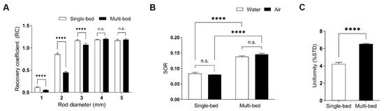 The RC values of 1–5 mm rods (A), spill-over ratios (SORs) (B), and uniformity values (C) of phantoms imaged in the single- and multi-bed systems. Statistical significance was defined as a p value less than 0.05 (**** p < 0.0001, n.s.= statistically nonsignificant difference).; %STD, percentage standard deviation.