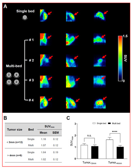 Representative PET/CT images of tumor-bearing mice after 18F-FDG injection in single- and multi-bed systems (A). The plane was chosen to best reflect the tracer uptake characteristics of each group. Comparison of tumor uptake values in single- and multi-bed systems based on tumor size (B,C), **** p < 0.0001, n.s.= statistically nonsignificant. PET/CT, positron emission tomography/computed tomography; SUVmax, maximum standardized uptake value.