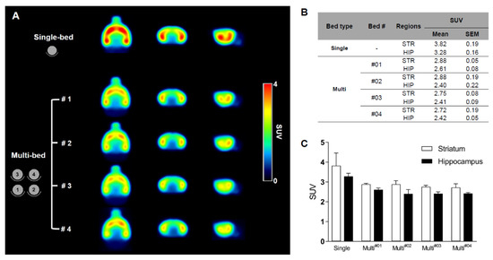 Summed 18F-FPEB brain PET images of the single-bed (n = 12) and each bed of the multi-bed system (A, n = 3 in each bed). Comparison of regional SUV values of single- and multi-bed systems (B,C). STR, striatum; HIP, hippocampus; SUV, standardized uptake value.
