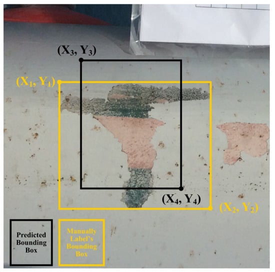 Let bounding box accuracy (BBA) be the measure of the performance of a detection model in terms of how accurately it predicts the defect’s bounding box compared to the label’s bounding box, as shown in (5) and illustrated in Figure 1.