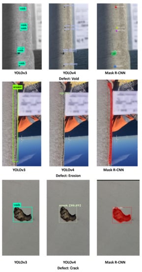 Example outputs of DL algorithms. The figure shows three outputs of YOLOv3, YOLOv4 and Mask R-CNN. All algorithms recognised the defects, however, YOLOv3 incorrectly classified a crack defect as a void defect; and the prediction boxes did not comprehensively cover the large-sized defect area, such as erosion defect, in YOLOv4.
