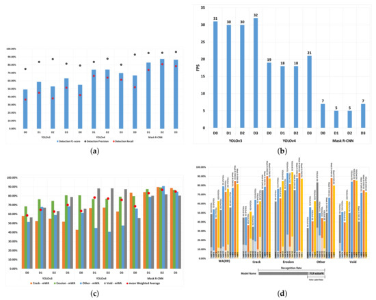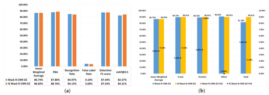 Figure 4b compares the mWA and FLR of each defect type for IE Mask R-CNN(D2) and Mask R-CNN(D2). The figure shows that the mWA value of defect type ‘other’ was lower by 0.81% compared to IE Mask R-CNN(D2), whereas the mWA values of all other defect types were higher (i.e., by 0.29% for crack, by 0.68% for erosion, and by 8.23% for void) compared to Mask R-CNN(D2). The fact that there was no improvement in detecting the ‘other’ type of defects when using the IE Mask R-CNN(D2) compared to Mask R-CNN(D2) is likely to be because the class ‘other’ only had 22 images in the original dataset, and therefore the models were not able to learn all the features of the defects of type ‘other’ due to complex defect data and lack of training data.