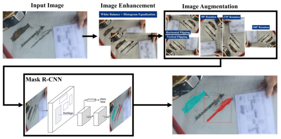 Image enhancement: Image enhancement and augmentation methods are initially applied to the dataset, and thereafter the dataset is trained using a Mask R-CNN algorithm. The architecture of the Mask R-CNN algorithm is described below. Image enhancement techniques include WB [36] and AHE [37,38]. WB normalises the images such that they have the same temperature. The IE Mask R-CNN pipeline utilises a WB image pre-processing tool developed by Afifi and Brown [39] that can automatically adjust the image temperatures. The IE Mask R-CNN pipeline includes the AHE technique which utilises a contrast enhancement algorithm implemented by Pizer et al. [38] to distinguish the areas whose colour is significantly different across the image set.