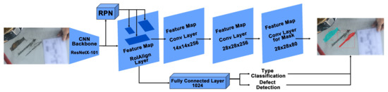 Mask R-CNN algorithm: Mask R-CNN [18] is the detection algorithm that is used in the proposed pipeline. The architecture of Mask R-CNN is shown in Figure 6. In the first stage, the pre-processed images are trained using a ResNetX-101 CNN backbone [40], and a region proposal network that generates a RoIAlign feature map that stores feature information of defects. In the second stage, a fully connected layer detects and classifies the detected defects. Moreover, additional convolutional layers learn the masked areas of the predicted defect areas.