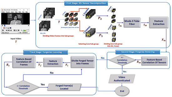 - First, the whole video sequence is geometrically constructed into sub-groups, and each sub-group is mathematically decomposed into a group of third-order tensors. Then, instead of comparing all the frame/feature correlations, a group of arbitrarily chosen core sub-groups is orthogonally transformed to obtain essential features to trace along the tube fibers. Moreover, if a forgery is detected, these features can be used to localize the forged frames with high accuracy;