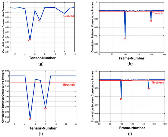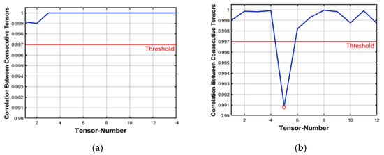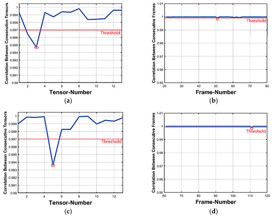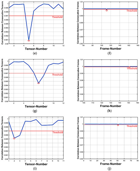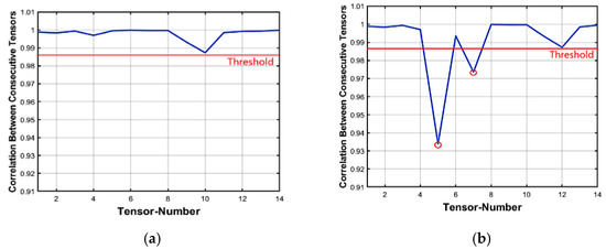 Here, the autocorrelation between consecutive tensors features is calculated. For example, after extracting SVD feature vector Xm for each mode-3 tube 2 D- matrix, the correlation coefficient between every two consecutive feature vectors is calculated using the standard Pearson correlation [36] as in Equation (14):