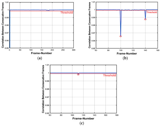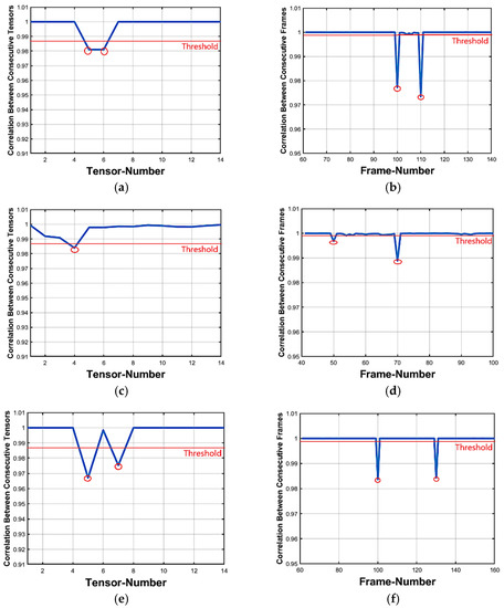 For more illustrations, let us consider a practical implementation for Algorithm 1. The tensor correlation distribution analysis of the original foreman video dataset is shown in Figure 3a. The video consists of 300 frames and is divided into 15 tensors and each tensor contains 20 frames. Figure 3b depicts the frame insertion forgery correlation distribution analysis after inserting 40 frames from external video starting as mentioned earlier. Now, considering Figure 3b, the two abnormal tensors-correlation drops comparing with the threshold value, (Algorithm 1—step 7) represent the start and the end forged tensors, respectively. These two abnormal points correspond to point 5 (which indicates correlation between the 5th and 6th tensors) and point 7 (which indicates correlation between the 7th and 8th tensors). This verifies that there are forged frames in tensors number 5, 6, and 7 respectively.