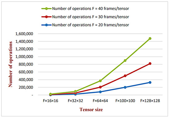 Table 4 illustrates the relation between tensor size and the total number of operations needed in the detecting and locating process. Through our simulation, 20 frames in every tensor are selected as it has a great reduction in the total number of operations while providing high detection accuracy. This relation also is graphically illustrated in Figure 6. The total number of operations per tensor is calculated using the MATLAB R2018a counting operations function. Compared with state-of-the-art methods, most of them calculate the correlation between the whole frame’s pixels/frame’s features of different frames along the video sequence. However, no previous data about computational complexity was mentioned before in state-of-the-art methods since it mainly depends on the programmer’s skills. It can be obviously seen that the proposed tensor structure is proven to provide a high reduction in the total number computations since a limited number of tensors of small size are needed for detecting and locating process instead of dealing with whole sequences and the entire frames/features.