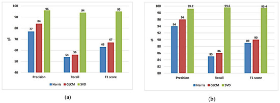 As shown in Table 5, the greater the number of frames inserted from the external video, the faster the forgery position is determined because this increase of forged frames causes a significant change in the content of the video. The charts in Figure 7a,b visually summarize the results of Table 5. It visually points out the superiority of the SVD feature extraction method in both detecting and locating phases, and it has the best results in terms of precision, recall and F1 score. For more robust investigations, the proposed scheme is tested against the increase in the number of frames inserted into the original videos.
