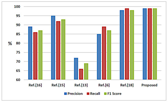 Comparison with the state-of-the-art is provided in order to compare the proposed scheme performance with different methods. We tested all methods on the same dataset. Table 7 summarizes the comparative results for both types of forgery among the recent techniques and the proposed one. The overall precision, recall and F1 score of the proposed methods are 99%, 95% and 96% respectively which shows superiority compared with published methods. Figure 10 illustrates these results.