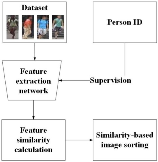 Supervised person re-ID: Supervised person re-ID methods conduct supervised training and testing on the same datasets [1,2,3,4,5,6,7,8,9,13]. As shown in Figure 2, the identity labels of pedestrian images are required. The features of the whole dataset are extracted by training the feature extraction network with the guidance of labels, which can be used to calculate the similarity between different images. According to the obtained similarity, the pedestrian images are sorted. A top ranked image contains highly similar features. Zheng et al. [19] explored how to use the generated data in training. Pedestrians are encoded as appearance and structure codes. Therefore, both self-identity and cross-identity people are generated, which make the dataset expansion become realistic. Considering both posture changes and unconstrained detection errors, a new joint learning method proposed by Li [20] integrates multi-scale attention selection and feature representation to maximize the relevant supplementary information of pedestrians.