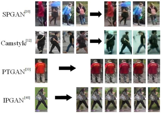 GAN-based person re-ID: The acquisition and learning of valid datasets are two main steps of recognition. GAN [31] adopts the adversarial learning. Generator and discriminator can interact with each other in the process of adversarial learning, which are conducive to improving the recognition performance of person re-ID. Therefore, GAN-based person re-ID methods are booming. A similarity preserving generative adversarial network (SPGAN) proposed by Deng et al. [10] maintains the self-similarity and inter-domain differences to eliminate the domain shift by transforming the labeled samples from the source domain (called cycle-consistent generative adversarial networks (CycleGAN) [32]) to target domain. Inspired by CycleGAN, the Camstyle network proposed Zhong et al. [12] achieves the data augmentation by transferring the camera style of each image to different ones. Wei et al. [33] introduced the semantic segmentation of images to person re-ID and proposed the person transfer generative adversarial networks (PTGAN) to alleviate the domain shift issue between different domains. Figure 3 shows the transformed images obtained by different GAN-based person re-ID methods.