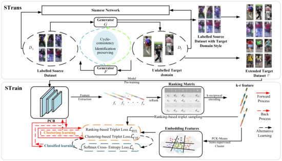 Similar to SPGAN [10], CycleGAN [32] is used to realize the basic style transformation, and Siamese Network [34] is applied to maintain the consistency of pedestrian identity. Figure 5 illustrates the structure of Strans (Style transfer stage). As shown in the upper part of Figure 5, Euclidean distance is used to measure the similarity between two different images. The images with high similarity are clustered.