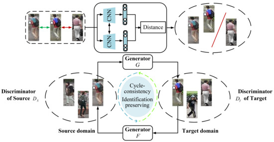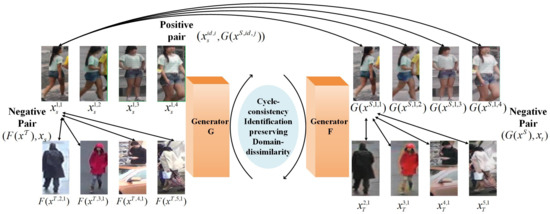 In Equations (3) and (4), loss functions use the binary labels of input image pairs. As shown in Figure 6, positive input pair and negative pair are designed to ensure the identity consistency and domain dissimilarity of pedestrians. Specifically, the i-th sample in source domain can be directly used to form a positive pair with any transformed image which has the same identity but not necessarily converted from the same sample. As the a priori knowledge that pedestrian images from two datasets do not cross and contain the same person, the pedestrians in the transformed images must be different from anyone from target domain. A negative pair is constructed as or .