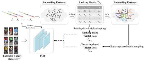 where is a triplet, m is the margin between positive and negative pairs as same as Equation (3), and for the anchor , i represents a certain class in P clusters, and j represents an instance under this class. Subsequently, benefiting from the PCK-Means, some samples could be added into , which is the new image training set with pseudo labels to optimize PCB. However, it is clear that the effectiveness of CTL is highly subjected to the correctness of the clustering result. Hence, ranking-based triple loss (RTL) is proposed as follows, which does not depend on any pseudo labels, but is only related to the sorting matrix .