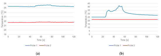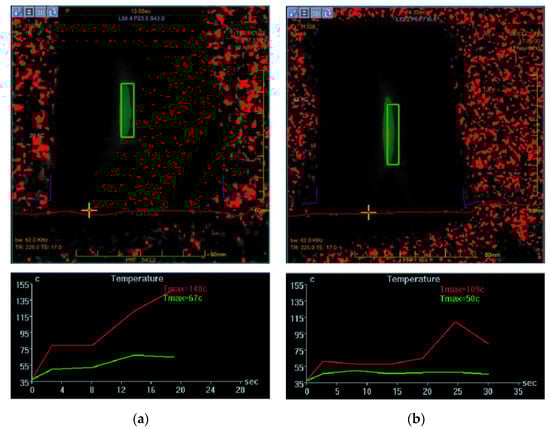 The images related to each region were acquired in subsequent temporal frames of 3 s, which allowed us to reconstruct the temporal trend of the temperature rise for each acquired area. The SNR value was calculated according to Equation (1):