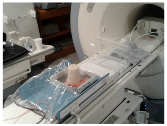 In this work, to quantify temperature increases in the interface area suffering from acoustic impedance discontinuity in the ultrasound wave-propagation path, we used a configuration composed of: (i) a standard phantom tissue mimicking the daily quality assurance (DQA) routine, as previously proposed by Zucconi et al. [40]; (ii) an ex vivo porcine skin sample placed under the phantom to simulate the patient’s skin; and (iii) a gel pad (between the porcine skin and ExAblate bed). A set of interferometric probes was also used to monitor the skin temperature, over the probes and gel pad (Figure 2). We assumed that the porcine skin would respond to the temperature increases like the human skin.