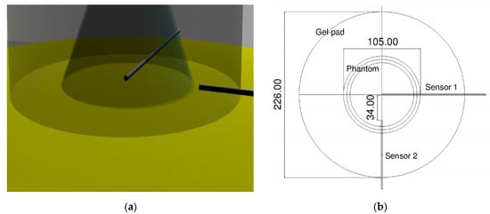 The bottom surface of the phantom was divided into two portions: a circular crown, which was never crossed by the ultrasound, and an inner area covered by the HIFU. One of the OTP-M probes was inserted into the middle of the circular region, and the tip of another one on the boundary between these two regions (Figure 3). Using this configuration, a mask for the relative positioning of sensors and phantom on the gel pad was designed. Then, this mask was reproduced on a plastic drape included in the “patient accessory set” necessary for the treatment, since this material did not introduce any acoustical impedance discontinuity.