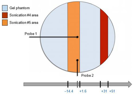 As shown in Figure 4, the acquired region of sonication #4 (red area) ranged from +35 mm to +51 mm, while the region of sonication #5 (orange area) ranged from −14.4 mm to +1.6 mm.