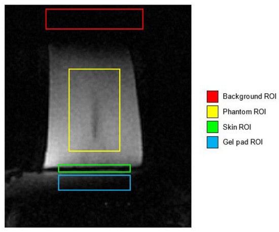 The three ROIs investigated for the SNR estimation are represented in Figure 5. The signal intensity of the phantom, the skin interface, and gel pad areas were compared to a region where the signal was ideally zero (i.e., the background ROI).
