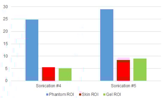 In some sonications, temperature-rising measurements were weakly perceived (ΔT < 1 °C) for the relative position along the hypersonic field; this was the case in the fourth sonication (Figure 10a). In other cases, like the fifth sonication, the temperature rose about 16 °C (Figure 10b).